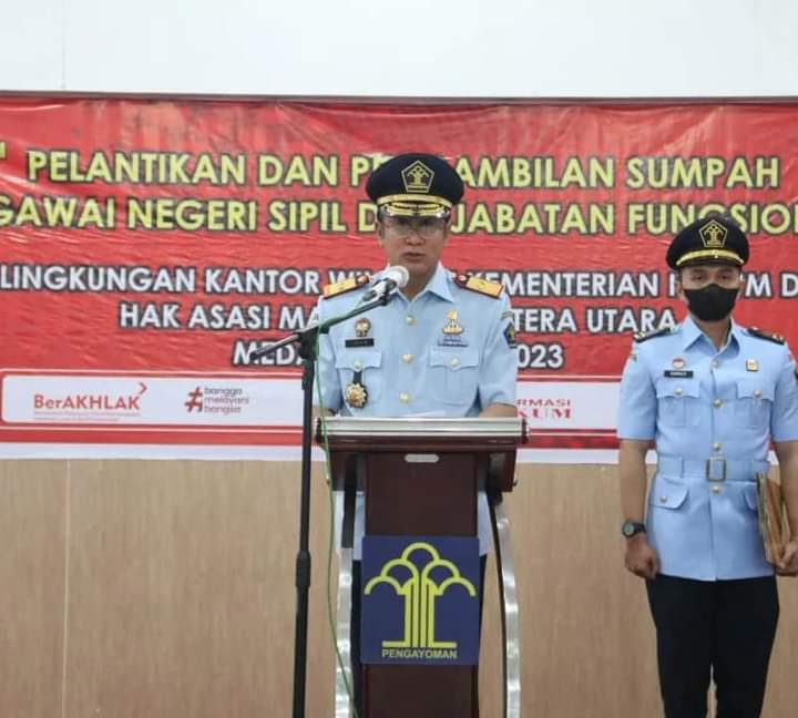 2 Orang PNS Lapas Kelas I Medan yang memenuhi syarat, diangkat sebagai Pegawai ASN, dilakukan pengambilan sumpah dan juga dilantik secara langsung oleh Kepala Kakanwil Kemenkumham Sumut, Imam Suyudi. Selasa Pagi (14/03/2023) Bertempat di Aula Soepomo Kepala Kantor Wilayah Kementerian Hukum dan HAM Sumatera Utara Imam Suyudi.
