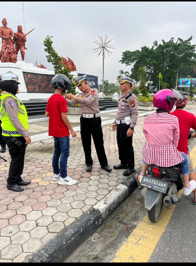 Direktur Lalulintas Polda Riau Kombes Pol Dwi Nur Setiawan, S.I.K., M.H yang didampingi Kasubdit Kamsel Ditlantas Polda Riau AKBP Irmadison, S.H melaksanakan kegiatan sosialisasi Berkeselamatan di Tugu Perjuangan Kota Pekanbaru, Kamis (12/01/2023)
