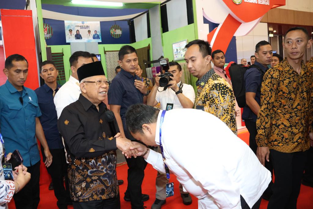 Wakil Presiden (Wapres) RI KH Ma’ruf Amin mengunjungi stand milik Pemerintah Kabupaten Tapsel, pada Apkasi Otonomi Expo 2023, di Hall 3 dan 3A Indonesia Exhibition Convention (ICE) BSD, Kabupaten Tangerang, Kamis (20/7).
