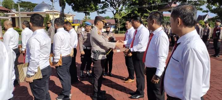 Kapolres Simalungun, AKBP.Ronald F.C Sipayung,SH.,SIK., MH memberikan penghargaan kepada tiga Pejabat Utama dan Personil yang berprestasi,Lapangan Apel Mako Polres Simalungun,di Jalan Jon Horailam Saragih Pematang Raya, Kabupaten Simalungun,Senin (15/05/2023) sekira pukul.08.30 WIB.