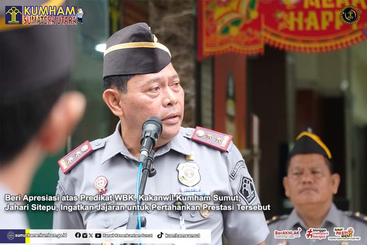 Beri apresiasi atas predikat Wilayah Bebas dari Korupsi (WBK) yang berhasil diraihnya, Kepala Kantor Wilayah Kementerian Hukum dan HAM Sumatera Utara, Mhd. Jahari Sitepu, ingatkan seluruh jajaran untuk bekerja keras mempertahankan dan meningkatkan prestasi besar tersebut. Senin, (18/12/2023).