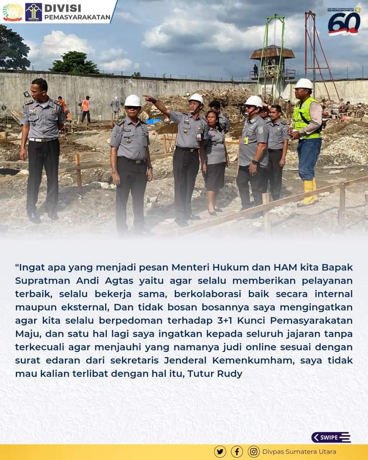 “Ingat apa yang menjadi pesan Menteri Hukum dan HAM kita Bapak Supratman Andi Agtas yaitu agar selalu memberikan pelayanan terbaik, selalu bekerja sama, berkolaborasi baik secara internal maupun eksternal, Dan tidak bosan bosannya saya mengingatkan agar kita selalu berpedoman terhadap 3+1 Kunci Pemasyarakatan Maju, dan satu hal lagi saya ingatkan kepada seluruh jajaran tanpa terkecuali agar menjauhi yang namanya judi online sesuai dengan surat edaran dari Sekretaris Jenderal Kemenkumham, saya tidak mau kalian terlibat dengan hal itu, Tutur Rudy