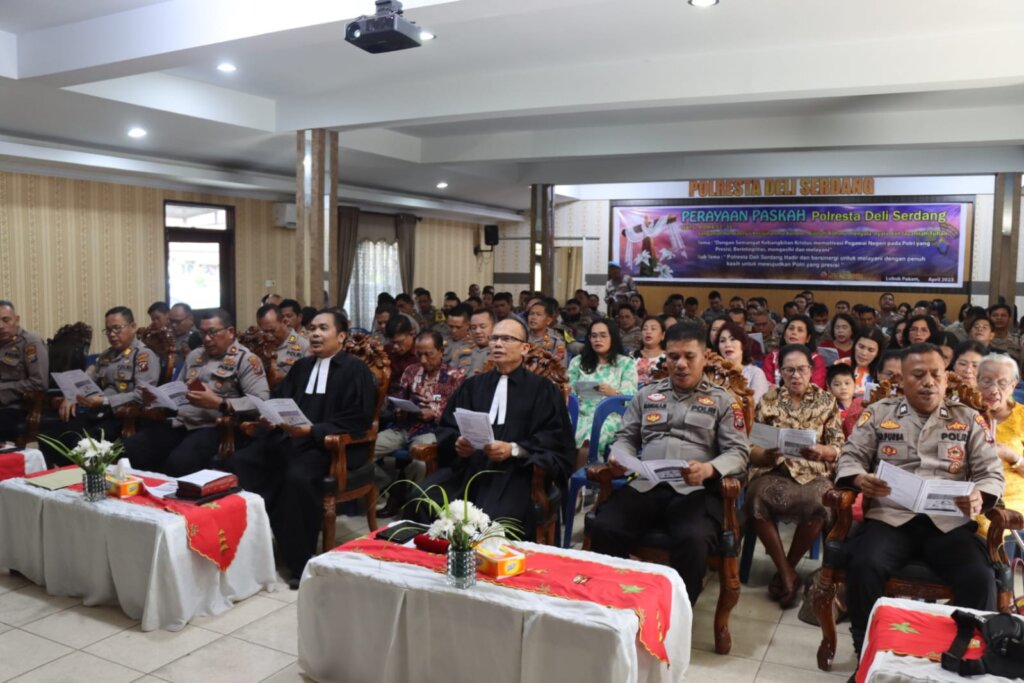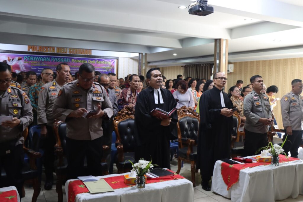 Keluarga besar Polresta Deli Serdang melaksanakan ibadah memperingati Hari Paskah di Aula Tribrata Mapolresta Deli Serdang, Sabtu (15/4/2023).