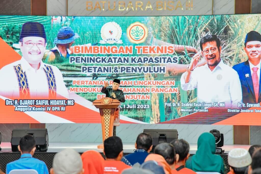 Kementerian Pertanian melalui Dirjen Tanaman Pangan beserta Balai Besar Peramalan Organisme Penggangu Tumbuhan (BBPOPT) menggelar bimbingan teknis peningkatan kapasitas petani dan penyuluh di bidang usaha pertanian di Pendopo Perjuangan Simpang Dolok, Kecamatan Datuk Lima Puluh, Kabupaten Batu Bara, Sabtu (01/07/2023).