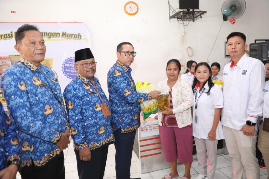 Tapanuli Utara-Bupati Tapanuli Utara Dr. Jonius Taripar Parsaoran Hutabarat, S.Si, M.Si, didampingi Kepala Dinas Ketahanan Pangan, Kepala Bagian Perekonomian dan SDA Setdakab dan Kepala Cabang Kantor Pos Tarutung meninjau pelaksanaan Operasi Pasar Pangan Murah dalam rangka memastikan ketersediaan dan stabilisas harga pangan pada Bulan Suci Ramadhan dan Idul Fitri 1446H yang diselenggarakan oleh Badan Pangan Nasional bertempat di Kantor Pos Tarutung, Senin (17/03/2025).