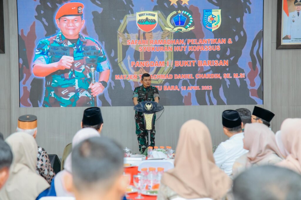 Kegiatan Safari Ramadhan Pangdam I BB dilanjutkan dengan pemberian santunan secara simbolis kepada sejumlah anak yatim dan pemotongan nasi tumpeng dalam rangka merayakan hari jadi ke 71 tahun Kopassus.