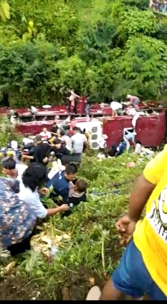 Diberitakan sebelumnya, bus berwarna merah sarat penumpang mengalami kecelakaan dan masuk jurang hingga terbalik di kawasan wisata Guci.