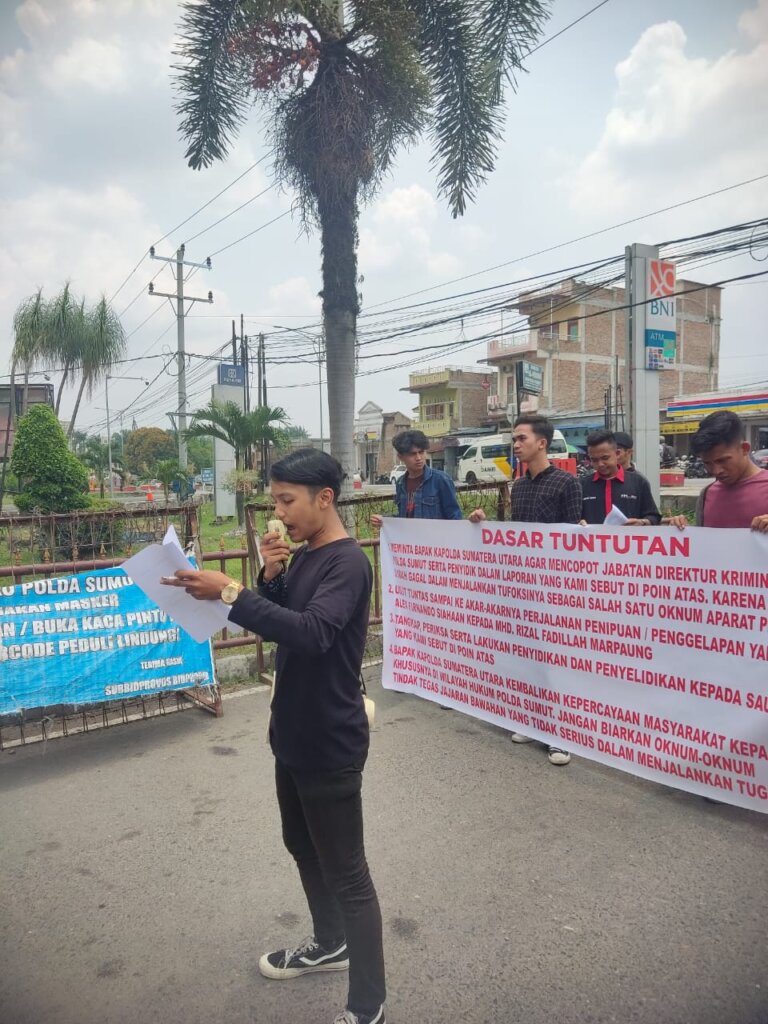 Dalam orasinya Ridos Berutu selaku kordinasi aksi dan Ismail Siregar kordinasi lapangan mengatakan Laporan tersebut telah tertuang dalam Pidana UU Nomor 1 Tahun 1946 KUHAP Pasal 372-378 Yang mana atas nama Alex Firnando Siahaan sebagai terlapor melakukan penipuan dan penggelapan Uang Milik Mhd.Rizal Fadilah Marpaung sebesar RP.150.000,000.000 (Seratus Lima Puluh Juta Rupiah) dengan alibi untuk dipergunakan usaha jual Minyak Kotor Kelapa Sawit.Kemudian Pada tanggal 3 Agustus 2022 Pihak Direktorat Reserse Kriminal Umum Polda Sumatera Utara mengeluarkan surat SP2HP.Namun sampai saat ini tidak ada tindakan yang dilakukan oleh Dirkrimum Polda Sumatera Utara kepada terlapor,padahal kasus ini sudah hampir memakan 1 tahun lama nya.
