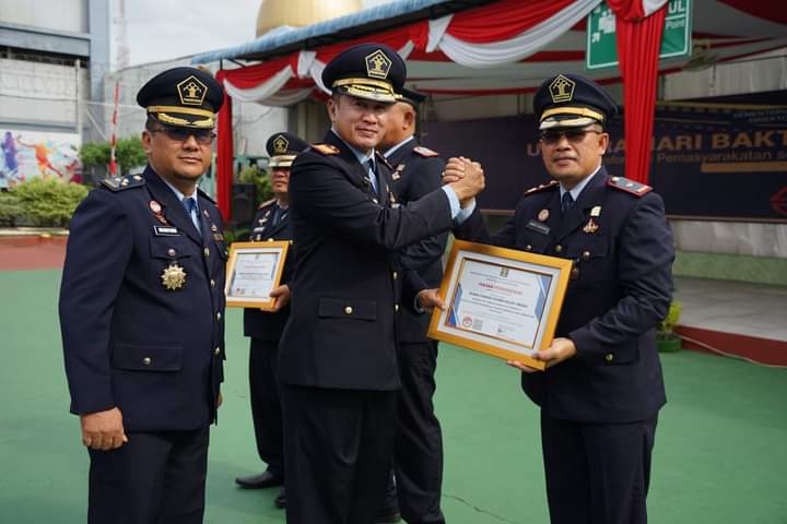Kepala Rutan Kelas I Medan Kanwil Kemenkumham Sumut yang didampingi beberapa pejabat structural mengikuti perayaan puncak dalam memperingati Hari Bakti Pemasyarakatan Ke 59 dan Halal Bihalal Kemenkumham Tahun 2023, yang dipusatkan di Lembaga Pemasyarakatan Kelas I medan, Selasa (2/5/2023)