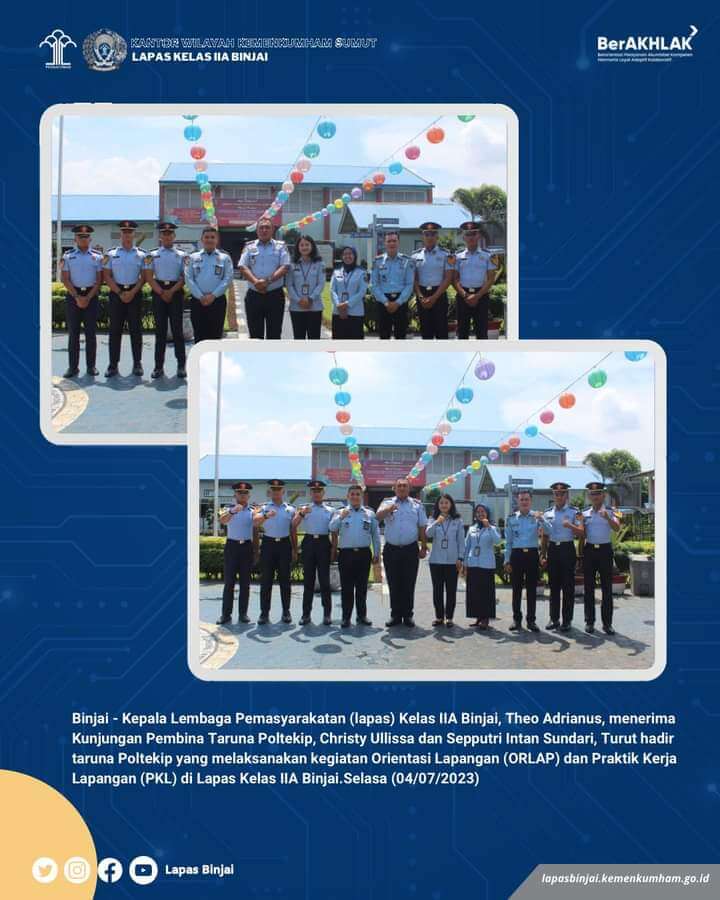 Kepala Lembaga Pemasyarakatan (lapas) Kelas IIA Binjai, Theo Adrianus, menerima Kunjungan Pembina Taruna Poltekip, Christy Ullissa dan Sepputri Intan Sundari, Turut hadir taruna Poltekip yang melaksanakan kegiatan Orientasi Lapangan (ORLAP) dan Praktik Kerja Lapangan (PKL) di Lapas Kelas IIA Binjai.Selasa (04/07/2023)