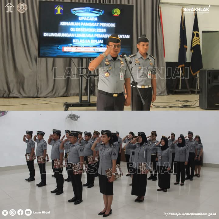 Binjai-Lembaga Pemasyarakatan (Lapas) Kelas IIA Binjai menggelar upacara kenaikan pangkat pegawai pada Kamis (05/12/2024) di Aula Lapas Binjai. Acara tersebut dipimpin langsung oleh Kepala Lembaga Pemasyarakatan (Kalapas) Kelas IIA Binjai, Anton Setiawan, dan diikuti oleh seluruh jajaran pegawai.