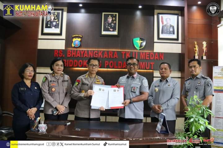 Medan-Kepala Kantor Wilayah Kemenkumham Sumatera Utara, Agung Krisna tandatangani nota kesepahaman bersama Rumah Sakit Bhayangkara TK II Medan. Penandatanganan nota kesepahaman dalam hal penyelenggaraan seleksi kompetensi bidang (SKB) Tes Kesehatan Pengadaan Calon Pegawai Negeri Sipil (CPNS) Kementerian Hukum dan HAM Tahun Anggaran 2024.