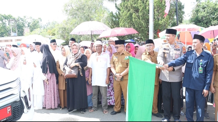 Kapolres Mandailing Natal (Madina) AKBP H.M Reza Chairul Akbar Siddiq S.IK., S.H., M.H, melepas 355 Jamaah Calon Haji yang diberangkatkan dari Masjid Agung Nur-Alanur Panyabungan menuju Asrama Haji Medan sebelum diberangkatkan dari Embarkasi Kuala Namu menuju Jeddah Arab Saudi. Senin, (22/05/2023).