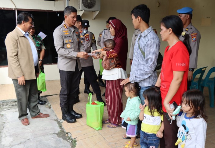 Kapolrestabes Medan Kombes Pol Valentino Alfa Tatareda bersama Wakapolrestabes AKBP Dr Yudhi Hery Setiawan SIK MSi kunjungan kerja (kunker) sekaligus memberikan tali asih kepada anak-anak penderita stunting dan anak-anak yatim, di Mapolsek Medan Helvetia, Selasa (7/3/2023).
