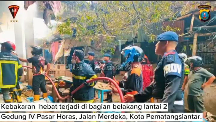 Pematang Siantar-Kebakaran melanda bagian belakang lantai dua Gedung IV Pasar Horas, Jalan Merdeka, Kota Pematangsiantar, pada [Minggu, 22/09/2024]. Personel Kompi 2 Batalyon B Sat Brimob Polda Sumut dipimpin oleh AKP Ronny Sarko, S.H., M.H., terjun ke lokasi untuk membantu upaya pemadaman api yang dengan cepat melahap sebagian besar lantai dua gedung tersebut.