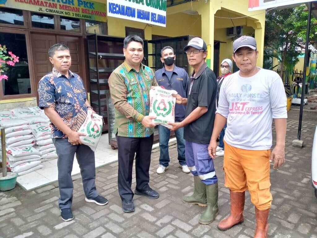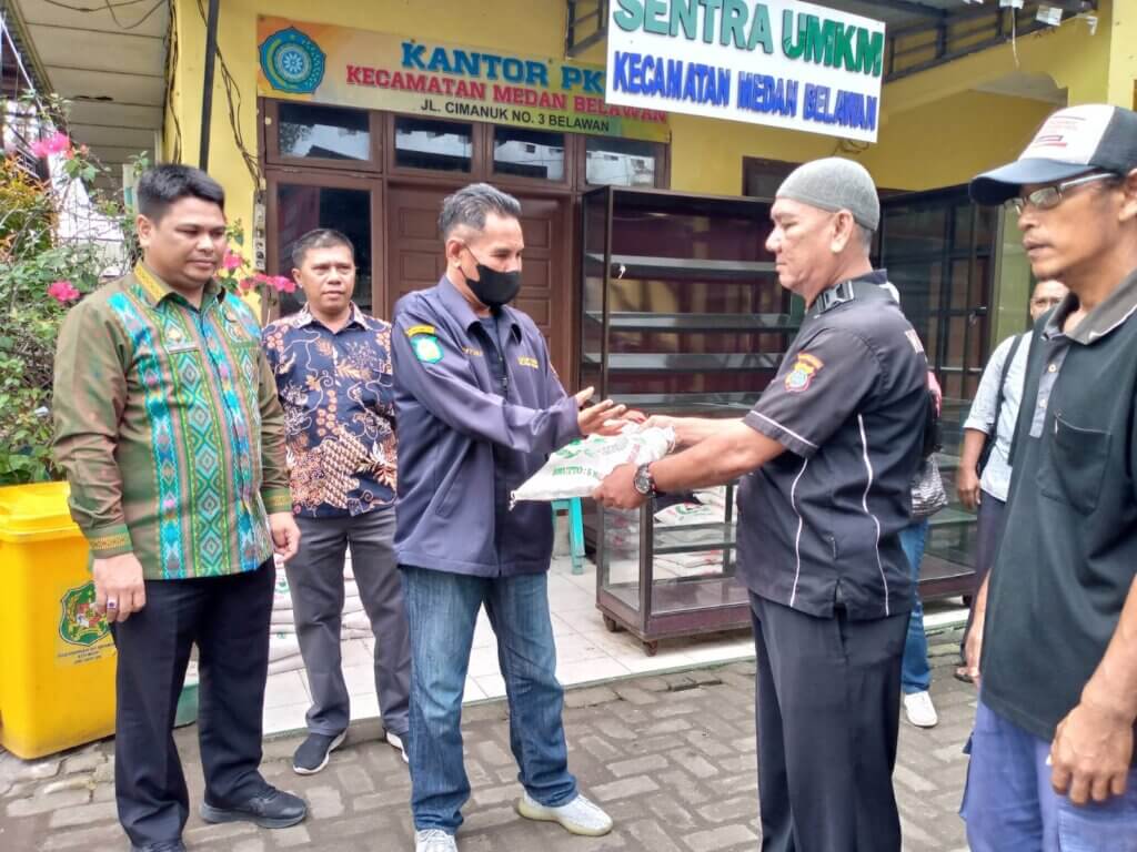 BELAWAN – ketua Karang Taruna Medan Belawan berbagi sembako berupa beras kepada rekan Jurnalis yang bertugas di Medan Utara dan petugas kebersihan di P3SU Kecamatan Medan Belawan.