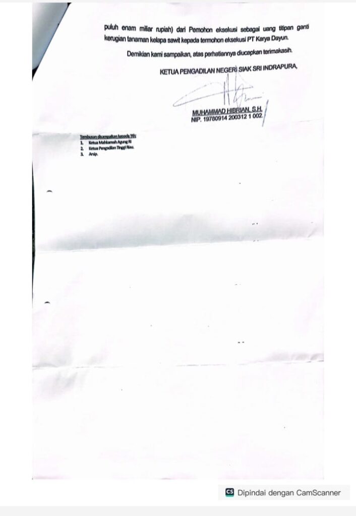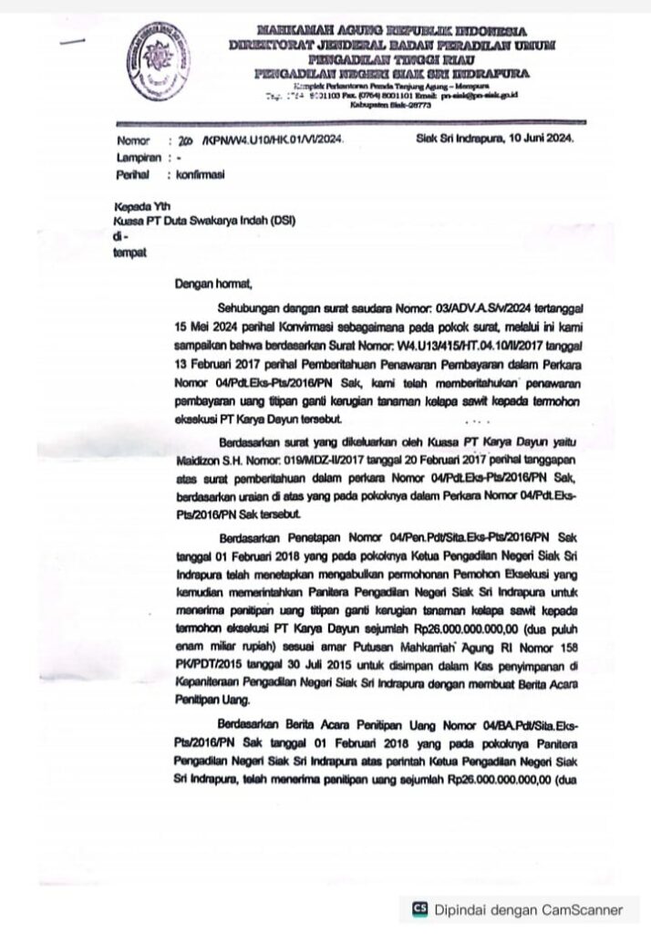 Dayun- Berdasarkan keputusan pengadilan Tingkat Mahkamah Agung Republik Indonesia melalui Pengadilan Tinggi Provinsi Riau dan pengadilan Negeri Siak Sri Indrapura memutuskan Bahwa PT. DSI (Duta Swakarya Indah) Memberikan pembayaran ganti kerugian Tanaman kelapa Sawit kepada PT.Karya Dayun sebesar 26 Milyar Rupiah Selasa,(2/7/2024).