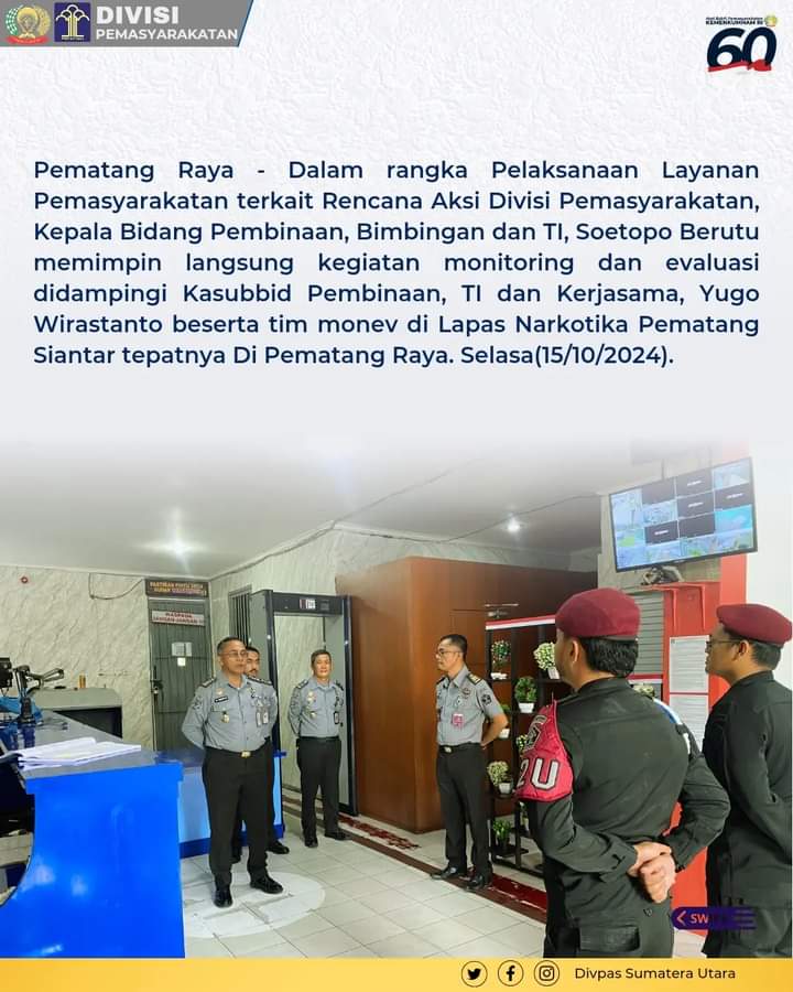 Pematang Raya-Dalam rangka Pelaksanaan Layanan Pemasyarakatan terkait Rencana Aksi Divisi Pemasyarakatan, Kepala Bidang Pembinaan, Bimbingan dan TI, Soetopo Berutu memimpin langsung kegiatan monitoring dan evaluasi didampingi Kasubbid Pembinaan, TI dan Kerjasama, Yugo Wirastanto beserta tim monev di Lapas Narkotika Pematang Siantar tepatnya di Pematang Raya. Selasa(15/10/2024).