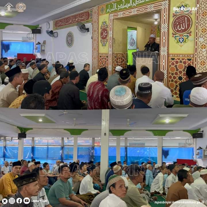 Binjai-Diawali takbir yang menggema di seluruh negeri, tak terkecuali di Lembaga Pemasyarakatan (Lapas) Kelas IIA Binjai, Petugas dan Warga Binaan Memperingati Hari Raya Idul Adha 1445 H / 2024 M, laksanakan Sholat Idul Adha berjamaah di Mesjid Taqwa Lapas Binjai, Senin (17/06/2024).