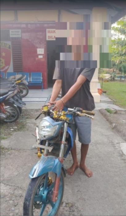 Terduga pelaku YMK ditangkap atas dugaan pencurian 1 unit sepeda motor Yamaha Vixion BK 2869 YAH milik korban Marihot Sitanggang, tetangganya sendiri.