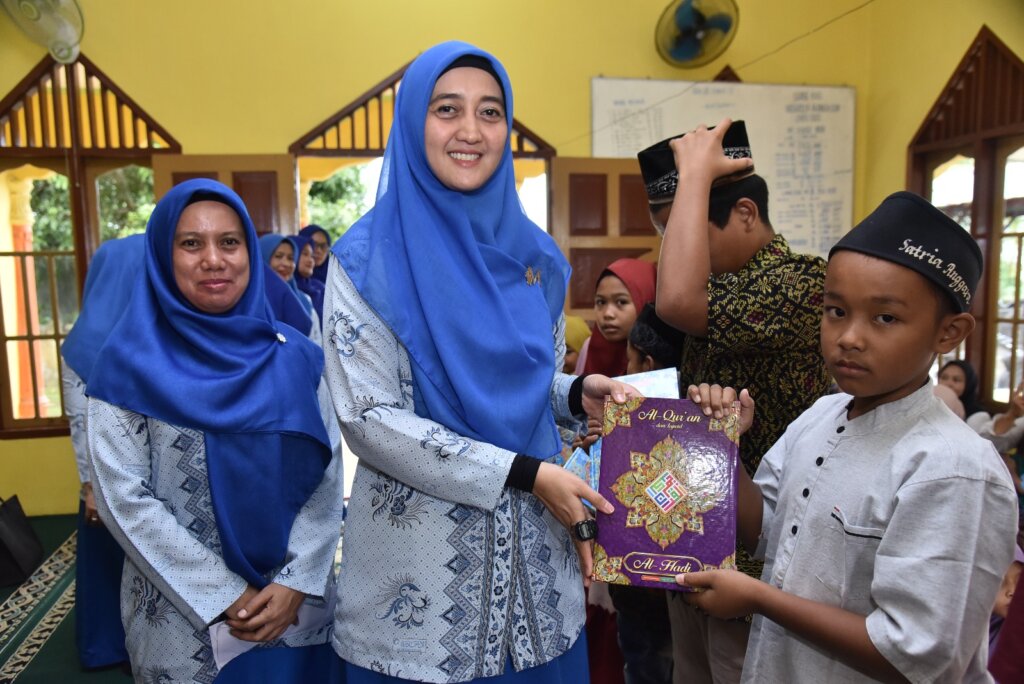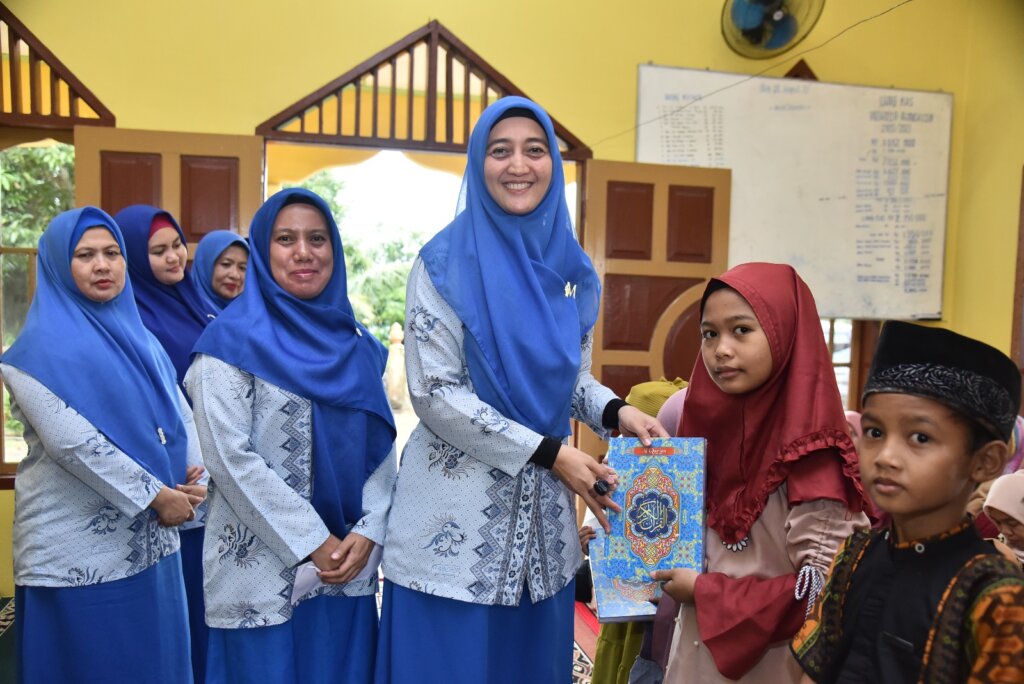 Ketua DPD Muslimat Al Ittihadiyah Kabupaten Batu Bara Ny. Hj. Maya Indriasari Zahir, S.E., menyerahkan bantuan Al-Qur’an dan honor guru mengaji Taman Bacaan Al-Qur’an Al Muklhisin di Dusun Jambu, Desa Pelanggiran, Kecamatan Laut Tador, Kamis (09/03/2023).