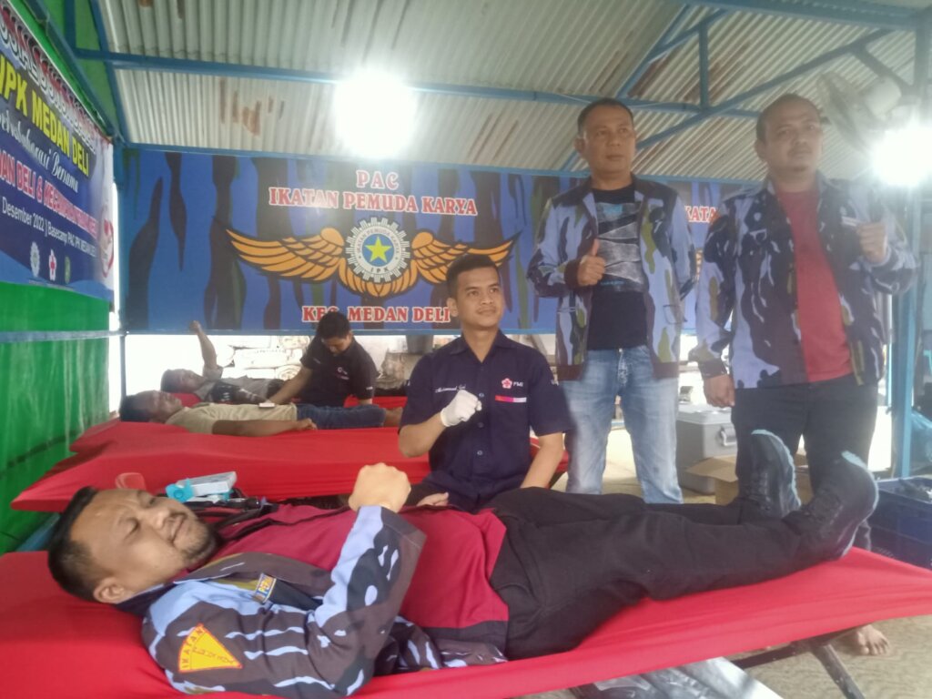 Medan Deli. Deli daily net. Sambut Tahun Baru 2023 , PAC IPK Medan Deli berkolaborasi bersama PMI dan kecamatan Medan Deli laksanakan bakti sosial donor darah Selasa 27/12/2022 bertempat di kantor PAC IPK Jalan Rumah Potong Hewan ( RPH ) kelurahan Mabar Medan Deli.
