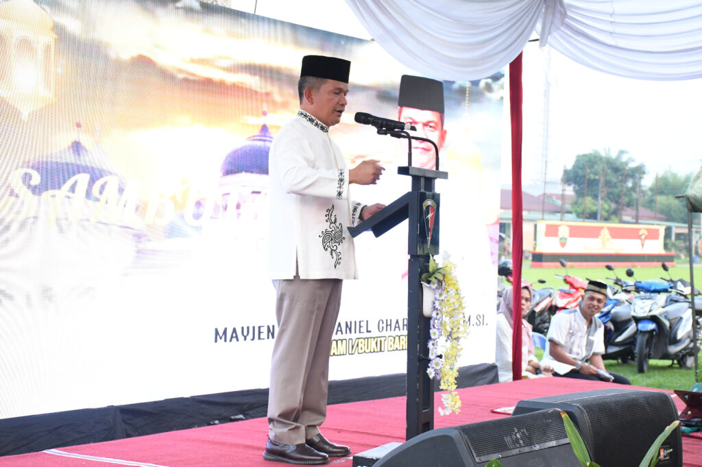 Dalam sambutannya Pangdam I/BB menyampaikan rasa syukur karena hari ini secara bersama-sama dapat melaksanakan peresmian Masjid Al Iman Al Musannif Yon Armed 2/KS.