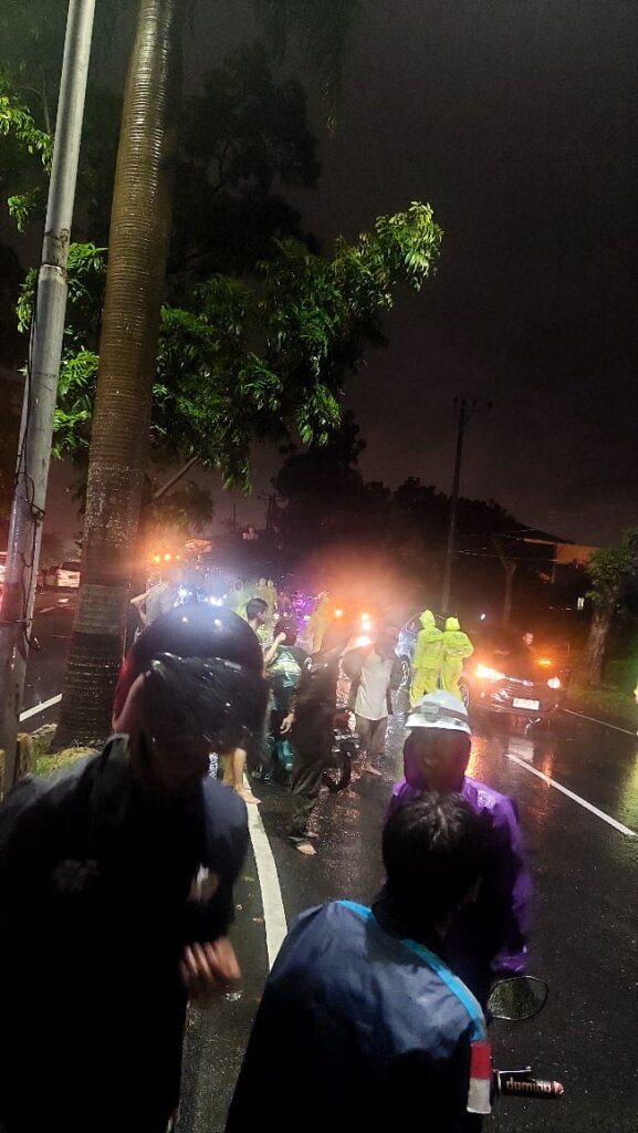 Wakasat Samapta Akp.Ferymon.SH.MH bersama anggota terus melakukan pengaturan lalu lintas dan membantu warga masyarakat di sekitar lokasi sekaligus untuk memastikan jika terjadi banjir susulan tidak terjadi kemacetan arus lalu lintas di sekitar lokasi