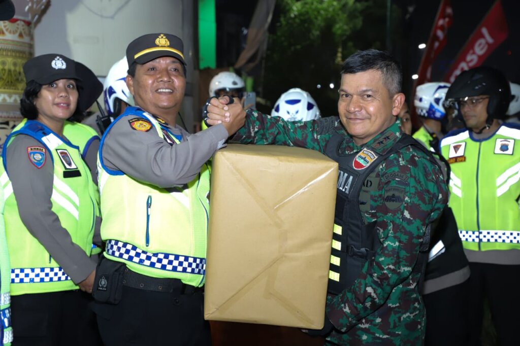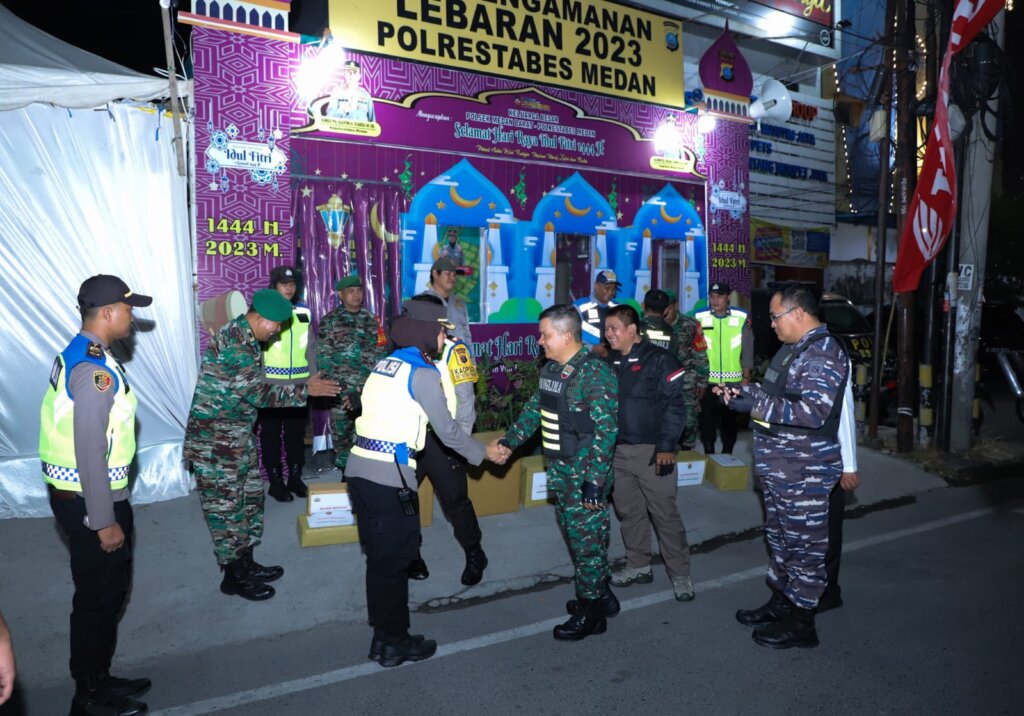 Setibanya di Jalan Kapten Muslim, Pangdam dan Kapolda Sumut memberikan bingkisan kepada personel yang bertugas di Pospam dalam melaksanakan tugas Operasi Ketupat Toba 2023 mengamankan malam takbiran dan lebaran Hari Raya Idul Fitri 1444 H di Kota Medan.