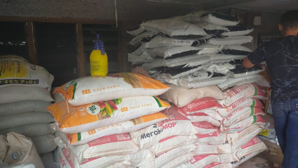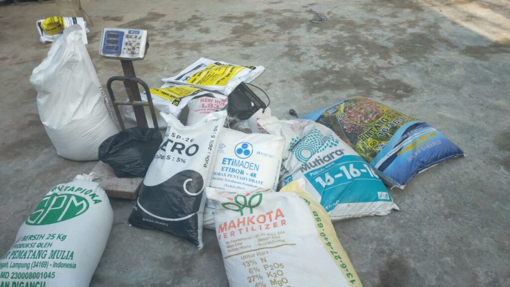 Dari lokasi ditemukan barang bukti berupa jenis merek pupuk adalah TSP 46 % P2O5, Mutiara 16-16-16, Mahkota Fertilizer, Pupuk NPK NtPhoska, Pupuk Kieserite Magnesium, SP -36, Tepung Tapioka, Kuda Sakti, Polivit-PIM, Bintang Sawit 16-16-16, Pupuk Petro dan Etimaden.