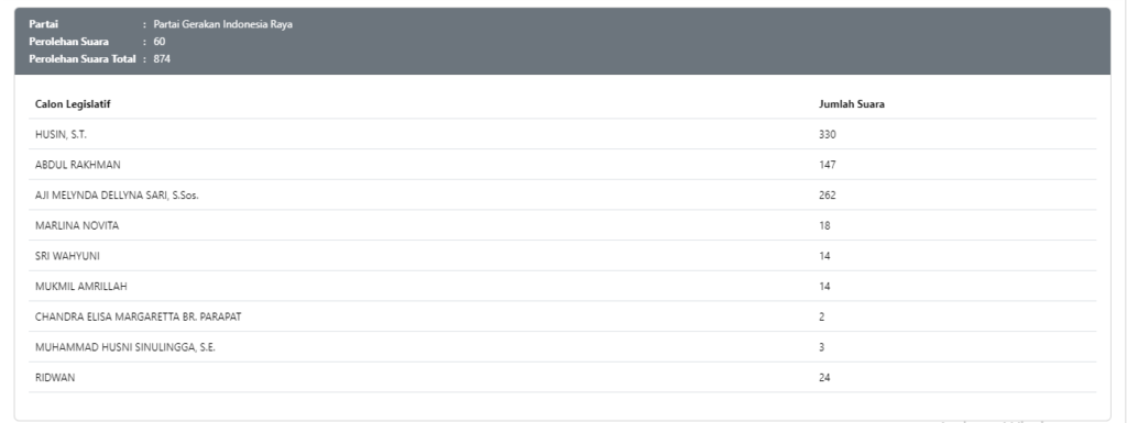 • Kandidat dengan Suara Terbanyak: Husin ST (330 suara), diikuti oleh Aji Melynda Dellyna Sari, S.Sos. (262 suara).