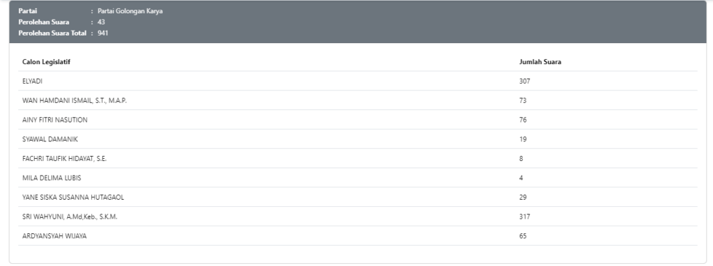 • Kandidat dengan Suara Terbanyak: Elyadi (307 suara), diikuti oleh Sri Wahyuni, A.Md., Keb., S.K.M. (317 suara).