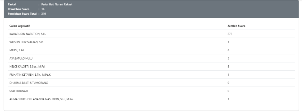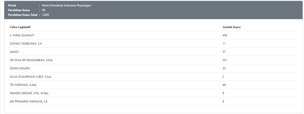 • Kandidat dengan Suara Terbanyak: Ir. Hiras Gumanti (458 suara), diikuti oleh Sri Nina RP Panggabean, A.Md. (351 suara).