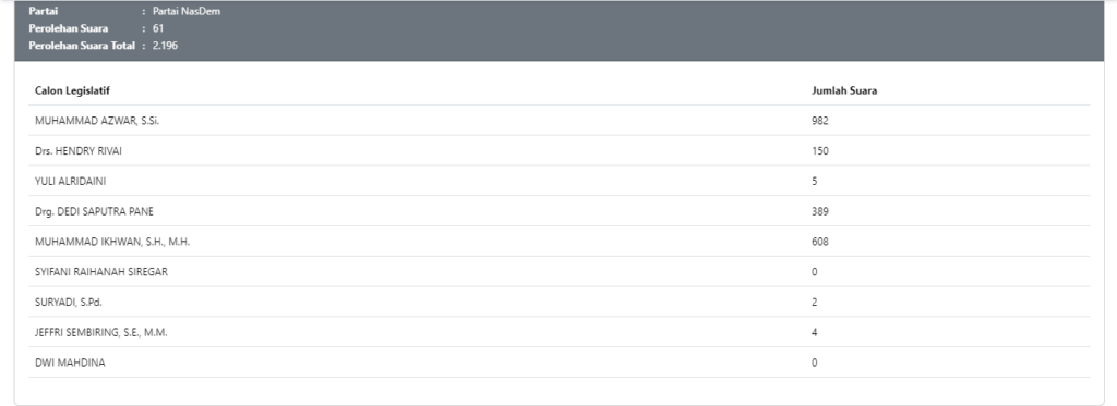 Tebing Tinggi, 16 Februari 2024 – Proses penghitungan suara Pemilihan Legislatif di Kota Tebing Tinggi untuk Daerah Pemilihan (Dapil) 1 terus berlanjut, dan data terkini yang diambil dari website resmi Komisi Pemilihan Umum (KPU) pada tanggal 16 Februari 2024 pukul 16:30 WIB menunjukkan perolehan suara sementara sebesar 31,82% dari total suara. Berikut adalah hasil perolehan suara untuk beberapa partai dan kandidat terkemuka:
