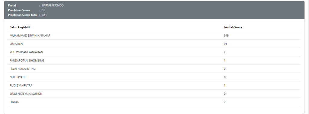 • Kandidat dengan Suara Terbanyak: Muhammad Erwin Harahap (349 suara), diikuti oleh Sim Siyen (95 suara).