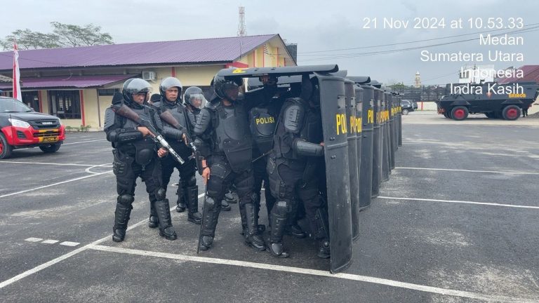 Medan-Dalam rangka mendukung pelaksanaan Pilkada Serentak 2024 di wilayah Provinsi Sumatera Utara, Batalyon A Pelopor Satuan Brimob Polda Sumut melaksanakan latihan kemampuan penanggulangan huru-hara (PHH). Jumat (22/11/2024)