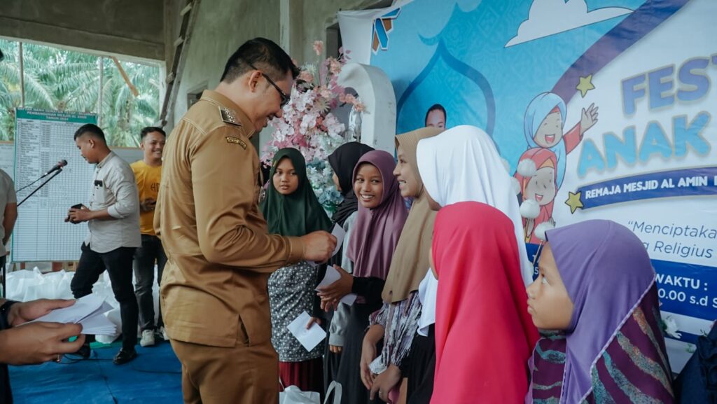 BATU BARA – Memperingati hari Asyura 10 Muharram 1446 Hijriah, Penjabat (Pj) Bupati Batu Bara Heri Wahyudi Marpaung, S.STP, M.AP., bersama Ketua Pj. Tim Penggerak PKK Hj. dr. Febyriani Heri Wahyudi, menghadiri festival anak soleh dan acara santunan bagi anak yatim/piatu di Masjid Al-Amin, Desa Benteng, Kecamatan Talawi, Selasa (16/07/2024).