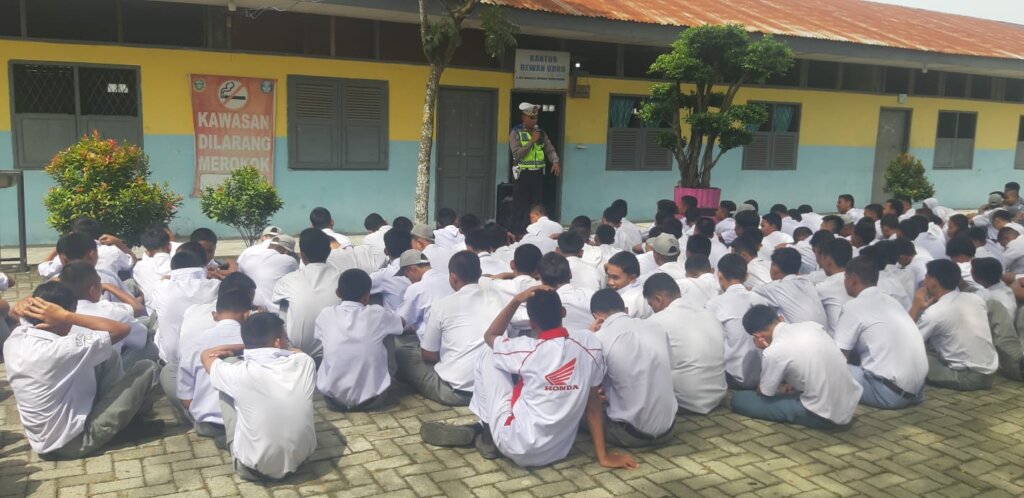 Satuan lalu lintas Polresta Deli Serdang berikan Himbauan dan Sosialisasi Tertib Berlalu Lintas dan Pencegahan Gangguan Kamtibmas/ Kenakalan Remaja (Police Go To School) kepada para siswa siswi SMK WIRA JAYA Psr VII Desa Wono Sari Kec. Tanjung Morawa Kab. Deli Serdang, Selasa (24/01/2023).