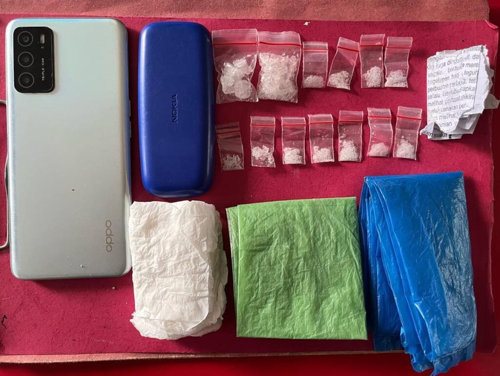 Saat dilakukan penggeledahan, personel Sat Resnarkoba menemukan 13 bungkus plastik klip transparan berisi serbuk kristal jenis sabu dari lokasi yang berbeda dengan berat 6,18 gram beserta beberapa barang bukti lainnya.