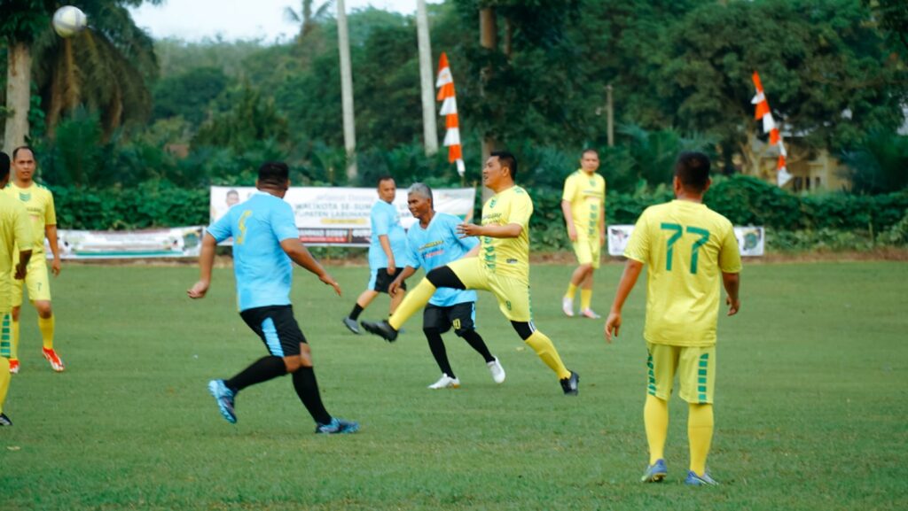 Pertandingan persahabatan yang terdiri dari tim Kesebelasan Kolaborasi kepala Daerah Se-Sumut melawan Kesebelasan Kades se-Labura berjalan dengan seru dan meriah.