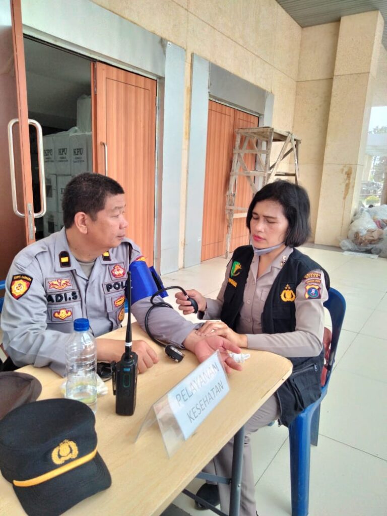 Untuk memastikan kesehatan seluruh anggota yang sedang melaksanakan pengamanan kotak suara di PPK, Plh.Kasi Dokkes Polrestabes Medan Penata TK I Betty Hutagaol, SKM bersama anggotanya, turun langsung untuk mengecek dan memeriksa kesehatan seluruh personil jajaran Polrestabes Medan yang terlibat dalam pengamanan di PPK maupun petugas PPK.Rabu (21/02/24)