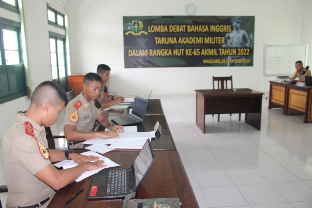 Dalam rangka rangkaian peringatan HUT ke-65 Akademi Militer Tahun 2022, pada hari ini dipertandingkan debat bahasa Inggris antar Taruna bertempat di Kelas A-1 sampai Kelas A-5. Senin (24/10/2022).